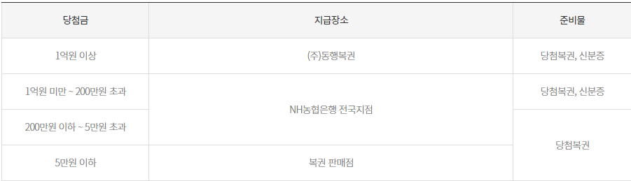지급장소 | 1-2등: (주)동행복권, 3-4등: NH농협은행, 5-6등: 복권 판매점 |
