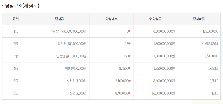 1등 | 10억원 | 6매 | 1/5,000,000 |