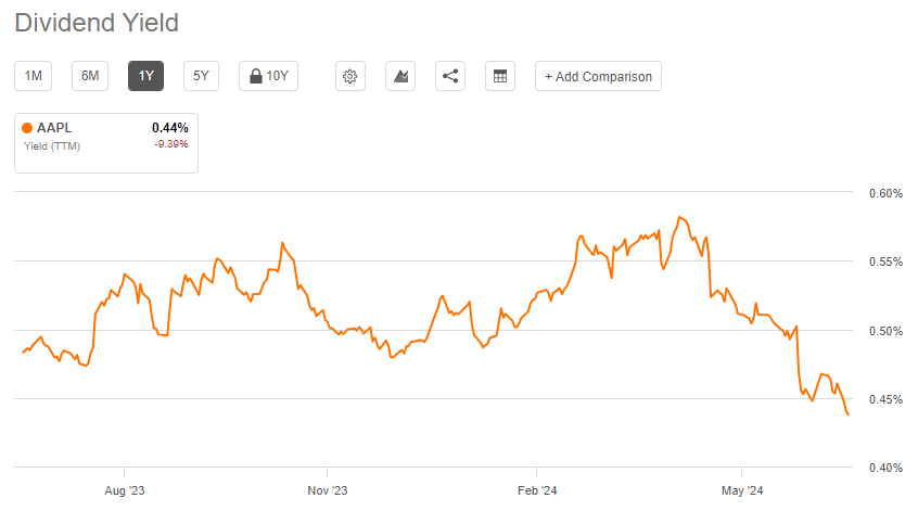 애플은 분기별로 배당금을 지급하고 있습니다. 현재 기준 배당률은 0.45%로, 성장주 특성을 고려할 때 적정한 수준으로 평가됩니다.